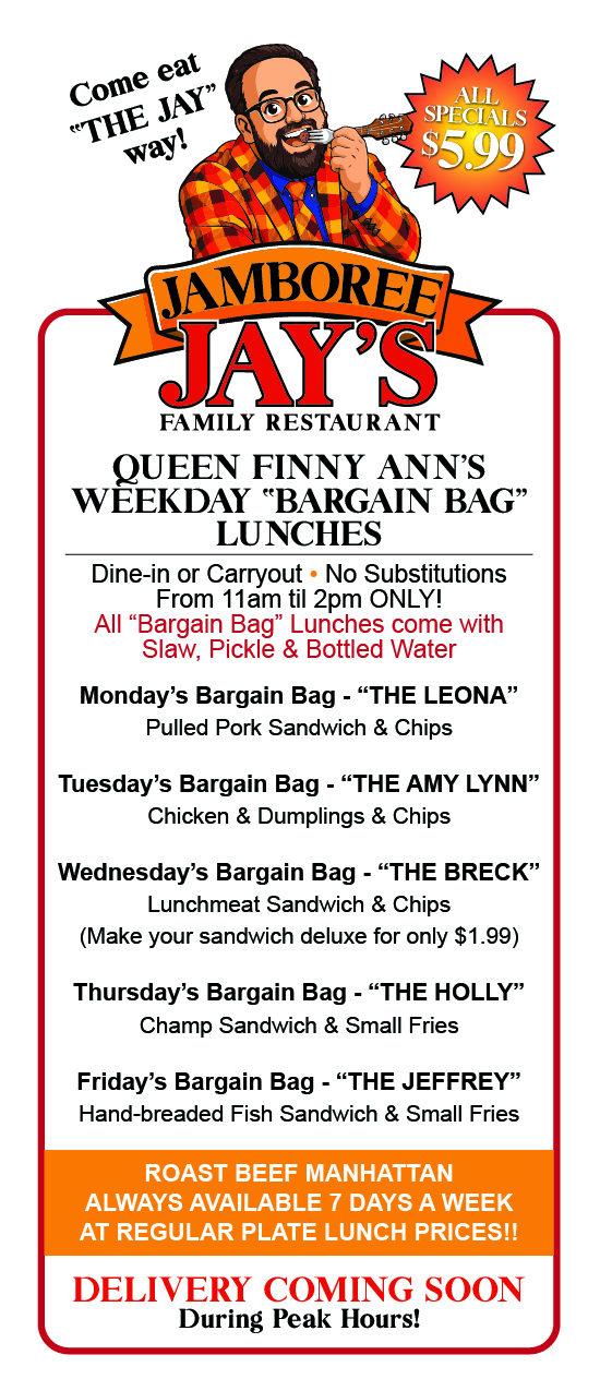 Plate Lunches & Dinners come with 1 Meat, 2 Vegetables, 1 Trip to Salad Bar, and a Roll or Fried Cornbread